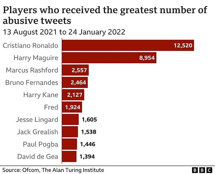 Абсолютный лидер – Криштиану Роналду. За сезон-2021/22 Криш получил 12 520 оскорбительных твитов. Второй – Харри Магуайр (8954). Третий – Маркус Рэшфорд (2554).