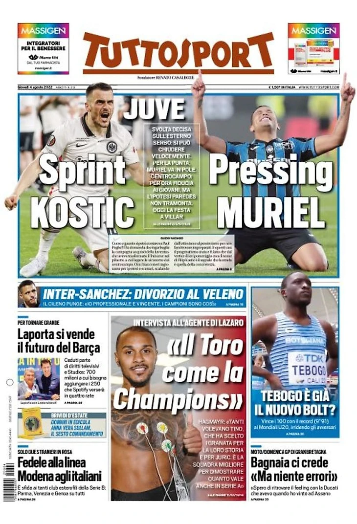 Решающий перелом по сербскому крайнему полузащитнику: закрытие может быть очень быстрым. По нападающему, Муриэль становится фаворитом. Полузащита: на данный момент доверие к молодёжи, но гипотеза Паредеса не угасает. Сегодня праздник в Виллар.