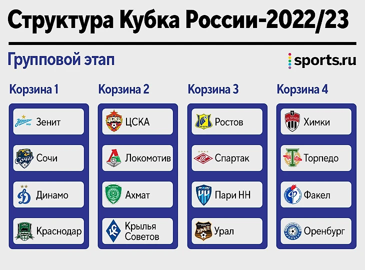 В нем участвуют все команды РПЛ-2022/23. По итогам жеребьевки составят 4 группы по 4 команды. Клубы распределены по корзинам на основе результатов за прошлый сезон.