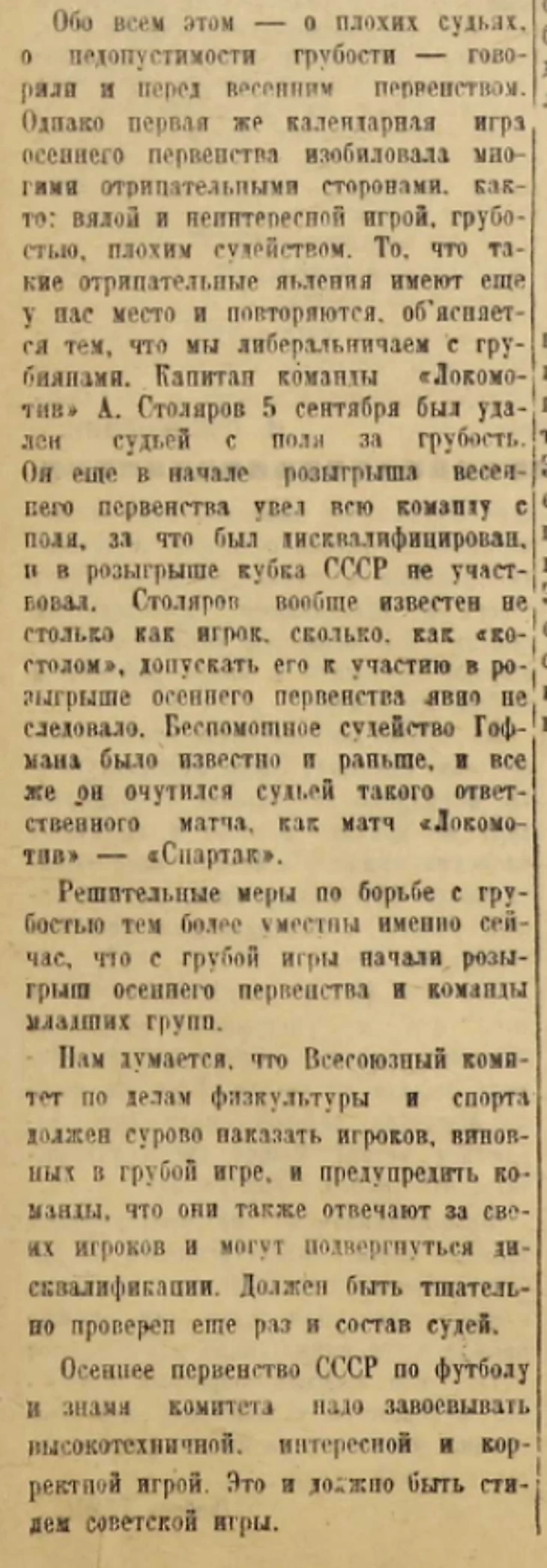 В первой игре осеннего первенства СССР по футболу, состоявшейся 5 сентября на "Динамо" приняли участие команды победителя "Кубка СССР" "Локомотива" и московского "Спартака".
