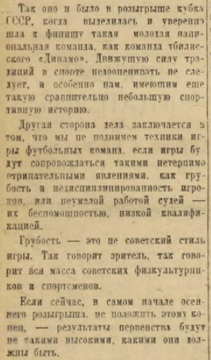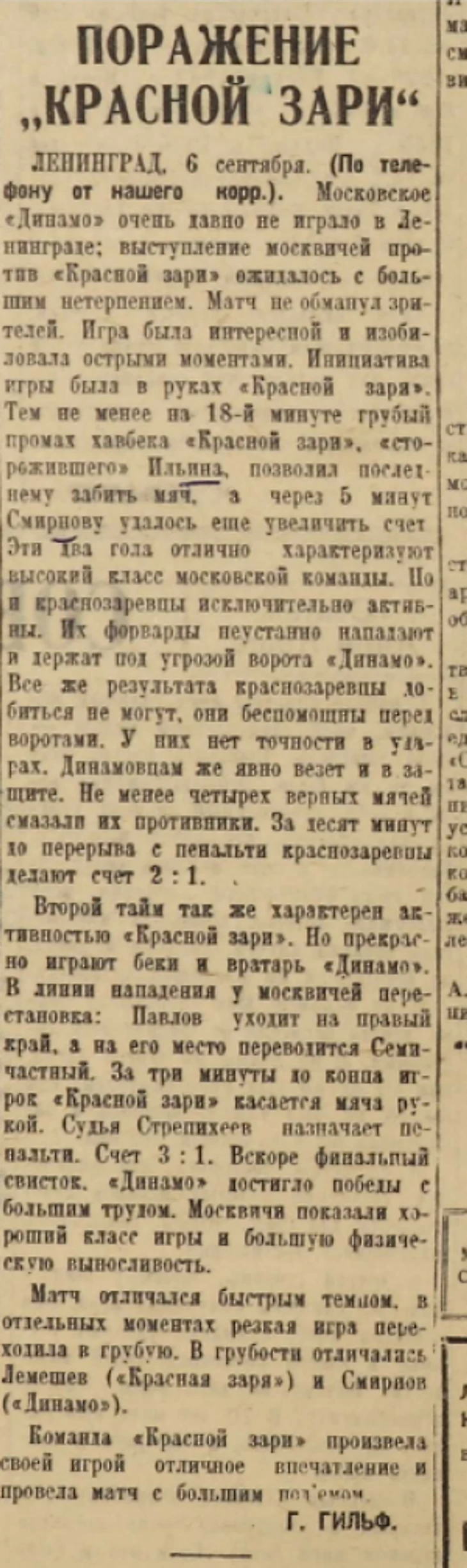 5 сентября на стадионе им. Ленина команда московского "Динамо" встретилась с ленинградской "Красной зарей" в календаре на первенство СССР. На 25-й минуте левый край "Динамо" Ильин прорывается к воротам, следует сильный и точный удар, и ленинградцы вынуждены начинать игру с середины поля. На 34-й минуте московское нападение разыгрывает красивую комбинацию и Смирнов вбивает второй мяч. Во время одной из атак "Красной зари" защитник "Динамо" берет мяч рукой, и судья назначает 11-метровый удар. Москвичи начинают игру с центра поля.