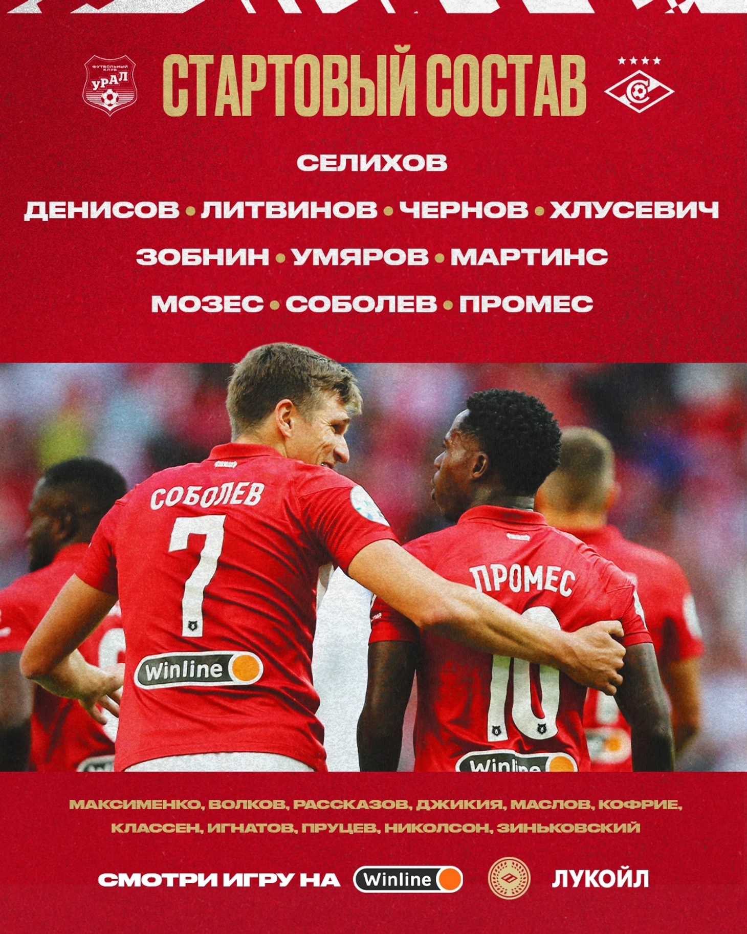 С первых минут в Екатеринбурге сыграют: Селихов, Денисов, Литвинов, Чернов, Хлусевич, Умяров, Зобнин (к), Мартинс, Мозес, Промес, Соболев.