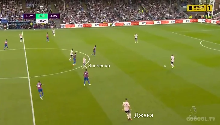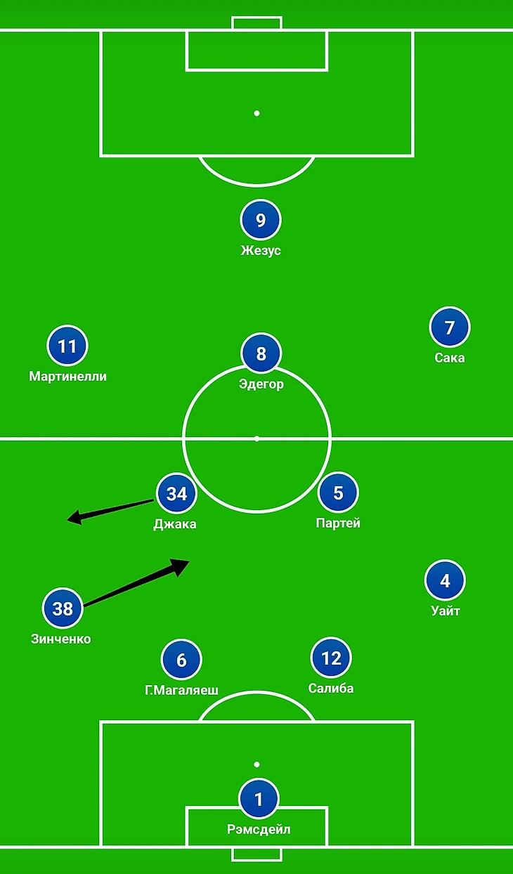 1. "Арсенал" с первых минут начал матч со схемой 4-2-3-1(впереди Жезус,Мартинелли и Сака).При владении мяча это схема часто превращалась в 3-4-3 по ходу игры.Где "Зинченко" помогает центральным полузащитникам,чтобы был перевес в центре поля.Эта роль часто выполнял "Канселу" в "Манчестер Сити",и сам "Зинченко".Поэтому,ему не предстояло труда этот роль "ложного фулбека".Иногда "Джака" подстрховывал его на левом фланге.