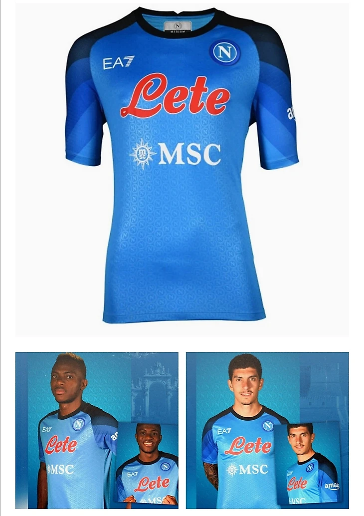 Новая домашняя форма «Наполи» 2022-2023 выполнена в голубом цвете с черным воротником и, выкрашенными в разные оттенки синего, рукавами. Футболку украшают тисненые логотипы клуба, которые покрывают всю лицевую сторону.