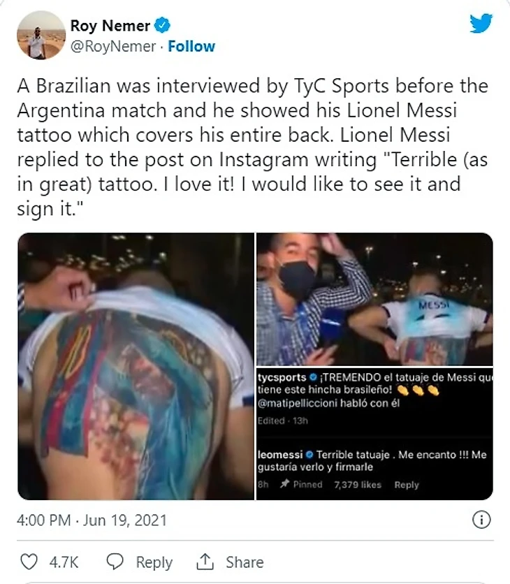TYC Sports опубликовало фото тату бразильского болельщика, и в комментарии пришел сам Месси!