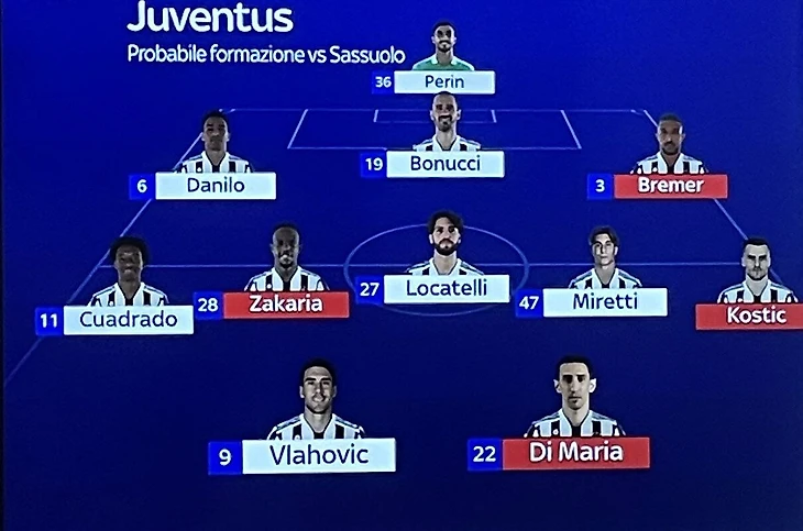 (3-5-2) Перин; Данило, Бонуччи, Бремер; Куадрадо, Закария, Локателли, Миретти, Костич; Влахович, Ди Мария.