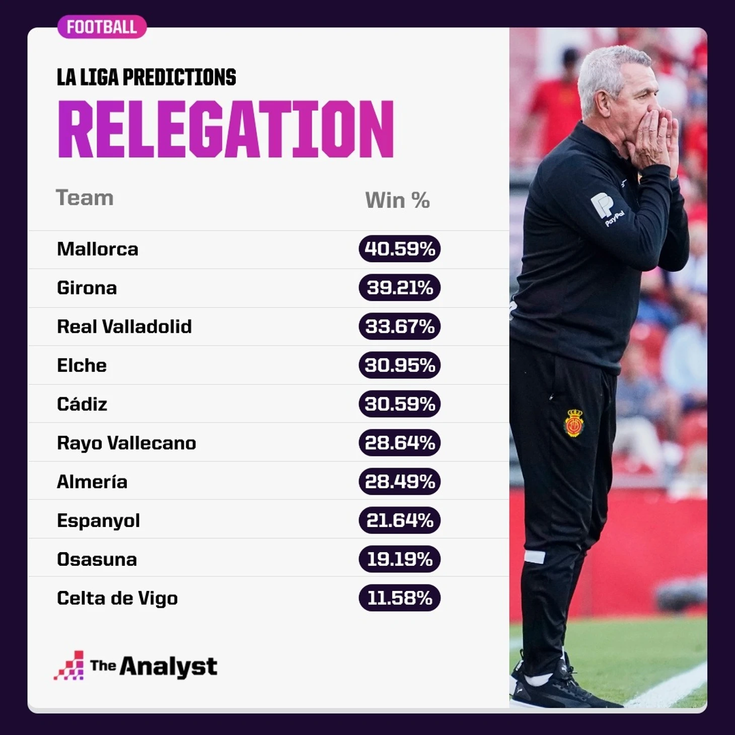 Это плохая новость для двух из трех недавно повышенных команд, поскольку «Жирона» (39,2%) и «Реал Вальядолид» (33,7%), похоже, вылетят снова. К ним добавится «Мальорка».