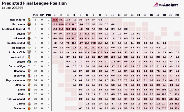 Есть мир, в котором «Хетафе» (0,04%) и «Валенсия» (0,03%) выигрывают Ла Лигу в 2022-23 годах. Но давайте будем честны, это, вероятно, не в том, в котором мы живем.