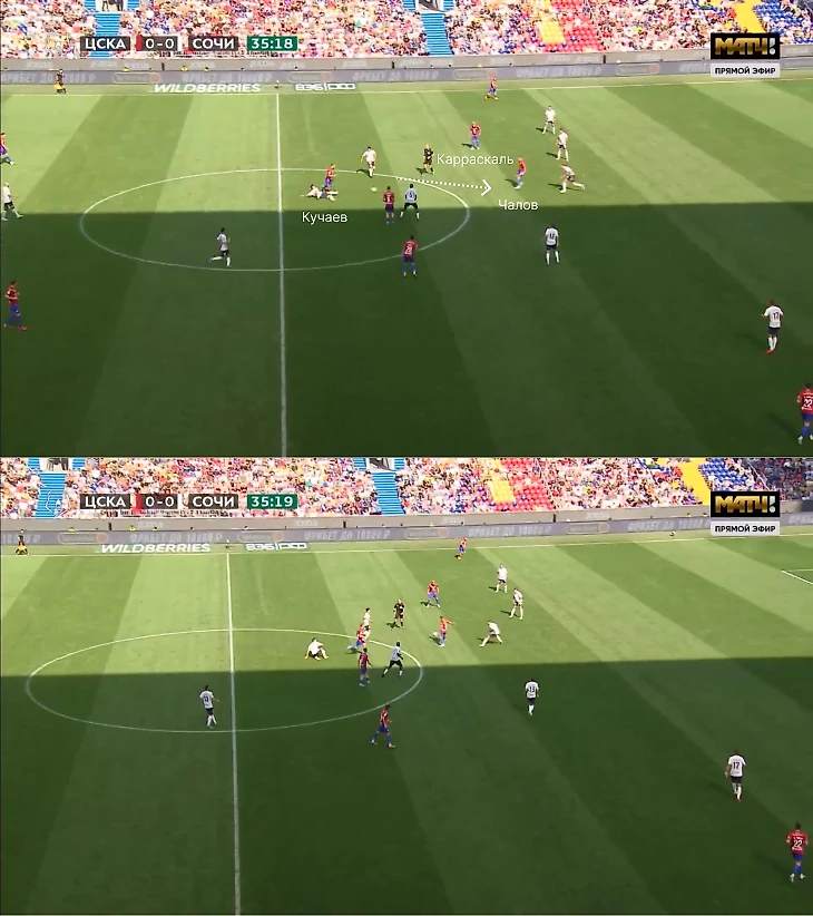 После передачи Зайнутдинова на Карраскаля Кучаев открылся в свободную зону за спинами опорников и Егорычева.