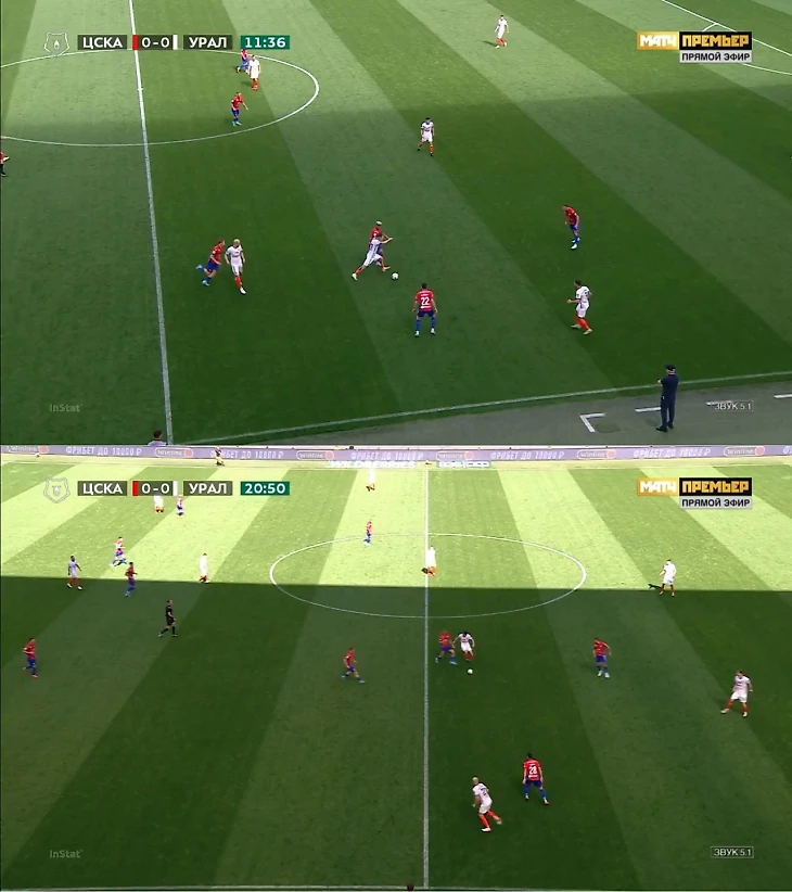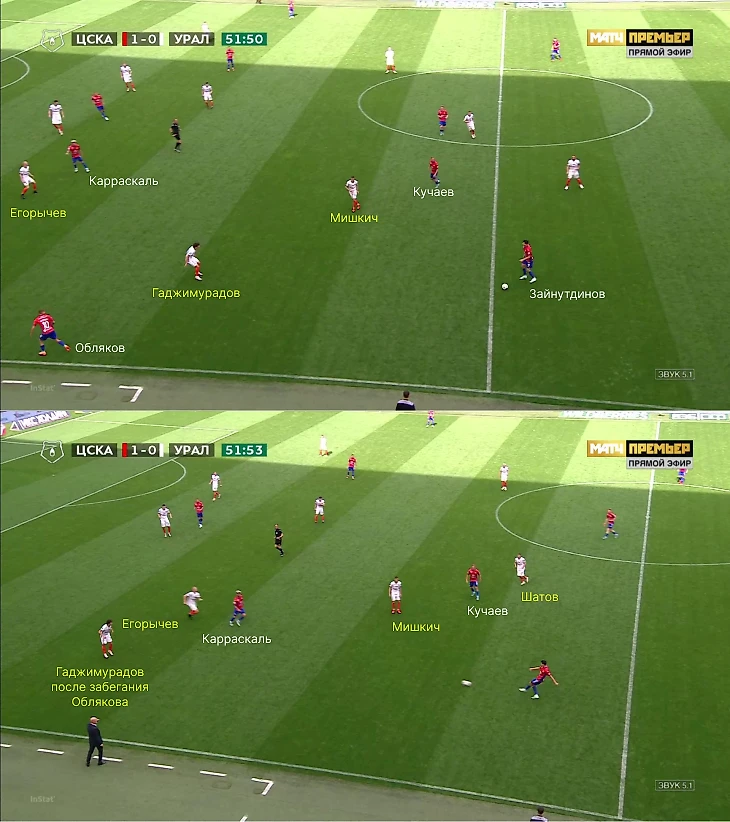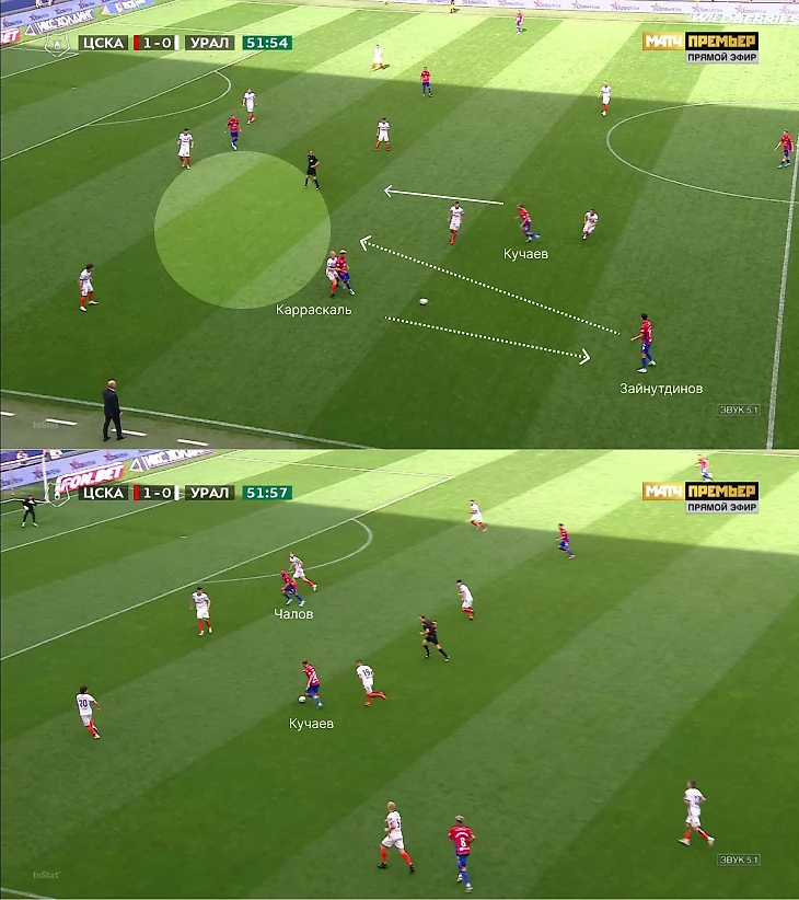 Пример из матча против «Урала». Этот эпизод показывает осознанность освобождения пространства и поиска зон на левом фланге. Карраскаля опекал крайний защитник Егорычев, Облякова – вингер Гаджимурадов.