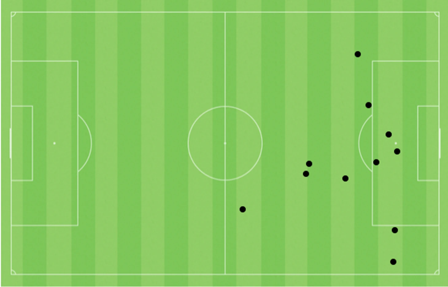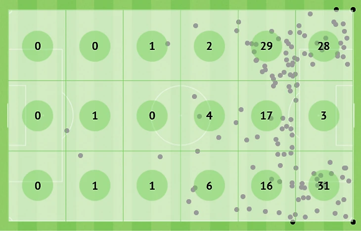 Главные атакующие инструменты – агрессия латералей и подачи с флангов. ЦСКА – второй по числу передач под удар после кроссов (3,5, но в процентном соотношении большинство команд впереди). Также много ключевых передач пришло после быстрой игры через края.