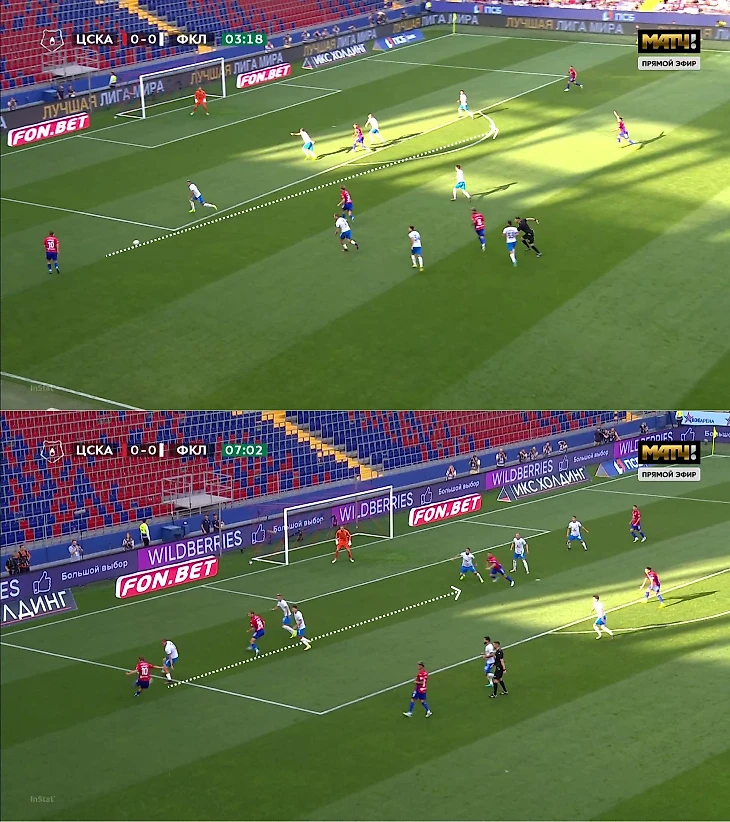Первая деталь быстрых переходов – прессинг или мгновенное давление после потери. Идеальный расклад для ЦСКА – зажать соперника на фланге и забрать мяч в ситуациях 1-в-1.