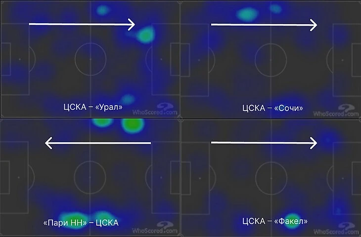 На флангах ЦСКА используется высокие позиции латералей – Обляков и Милан Гайич практически превращаются в крайних нападающих. Обляков – четвертый по передачам под удар после Карраскаля, Медины и Чалова (2,38 за 90 минут).