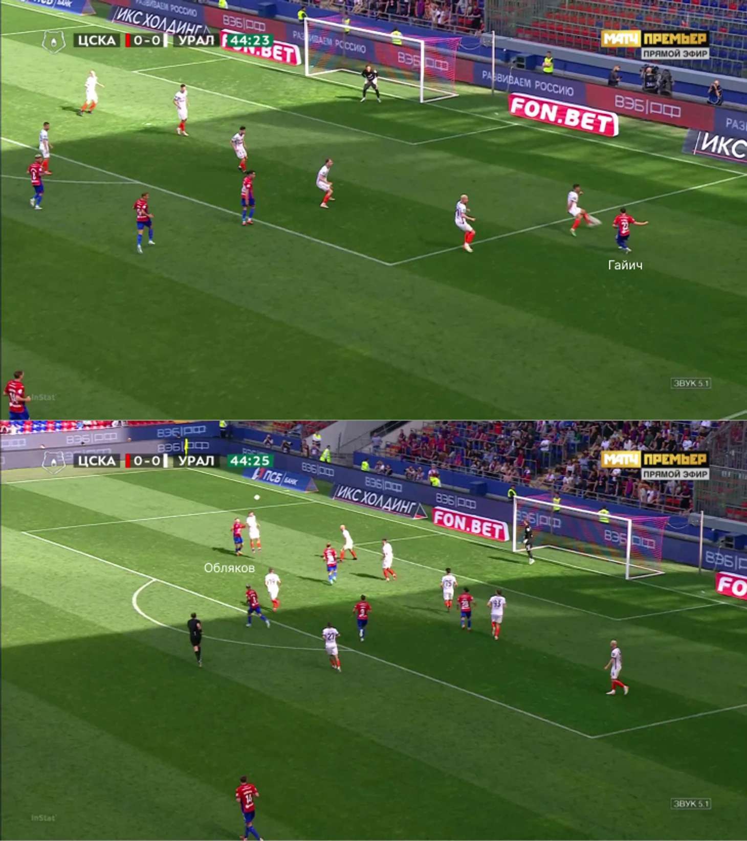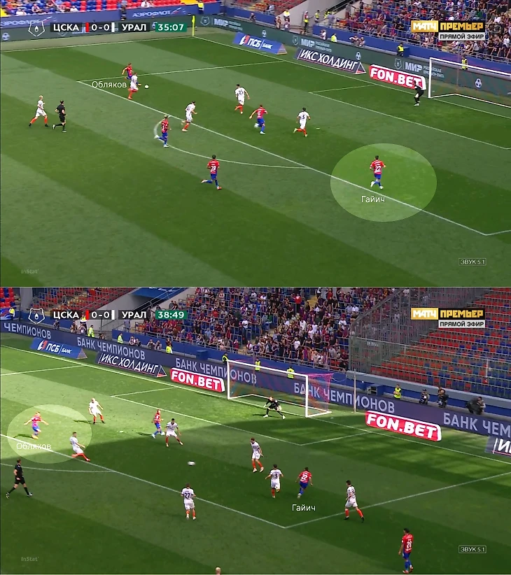 Обляков и Гайич – одни из самых активных игроков ЦСКА у чужой штрафной. Мы уже затронули деталь, что они высоко подключались и менялись позициями с инсайдами (особенно Обляков). Например, в начале игры с «Факелом» Обляков выполнил несколько опасных прострелов.