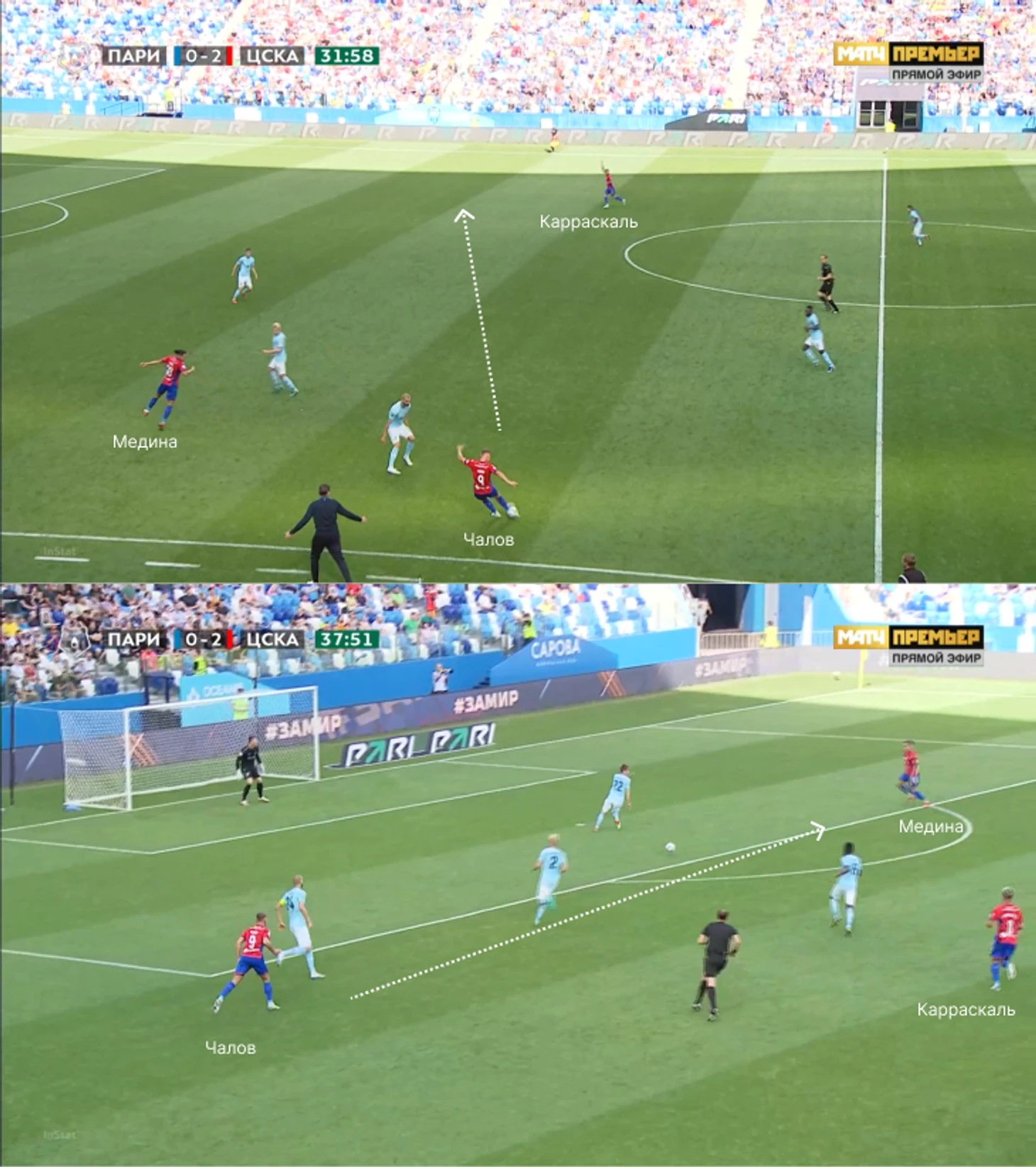 Рывки Чалова на фланг тоже приводят к опасности у чужих ворот. Так в матче с «Пари НН» смещения Федора позволяли инсайдам оказываться на свободном пространстве.