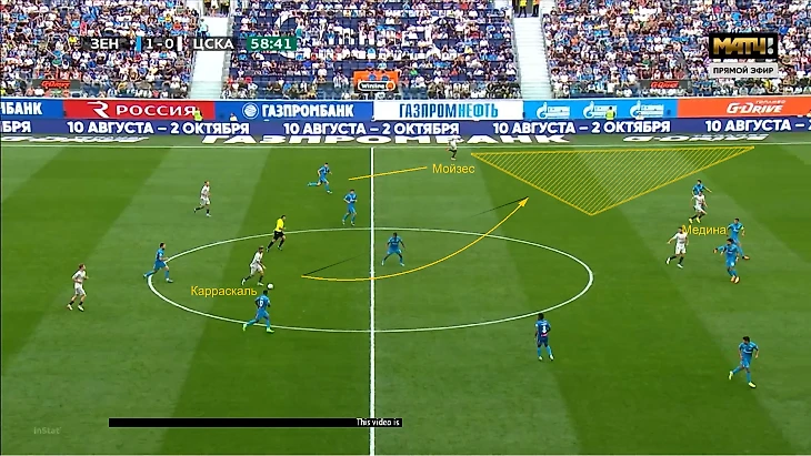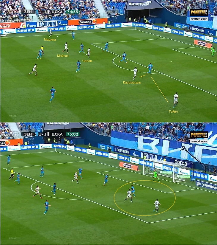Цепочка запустилась из-за потери компактности. В первом тайме «Зенит» успевал откатиться, но в этот раз ЦСКА классно воспользовался замедленным переходом. Во-первых, Карраскаль получил свободное пространство в середине, так как на него выдвинулись с опозданием. Во-вторых, Медина хорошо загрузил Адамова, освободив левый фланг для Мойзеса.