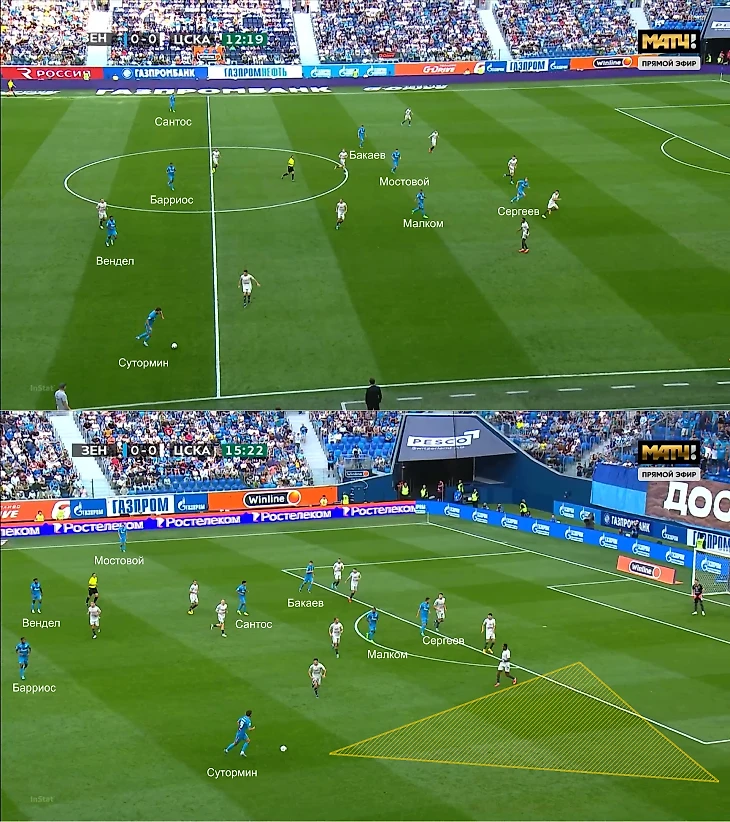 Другая проблема из-за периодического блуждания восьмерок – Вендел задерживался в глубине, помогая преодолевать давление ЦСКА. Из-за этого Сантос и Мостовой оказывались в ситуации, схожей с уже указанной проблемой Сутормина.