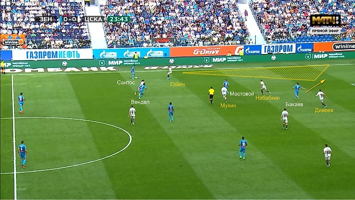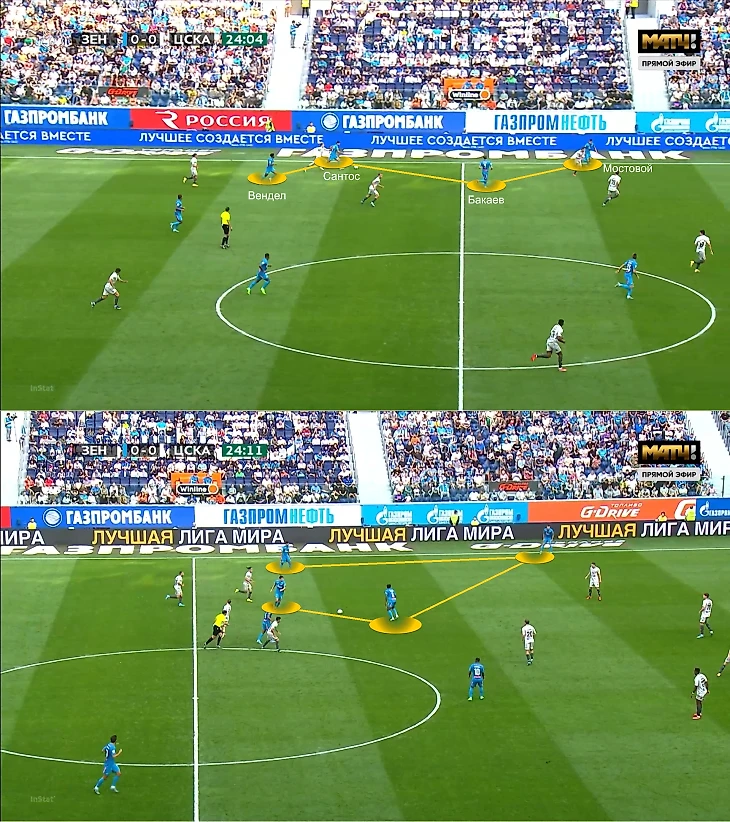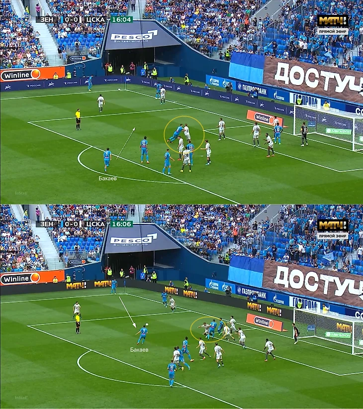 Ключевая качественная адаптация, которую «Зенит» использовал в большинстве матчей – смещения восьмерок в одну зону для фланговых комбинаций. Учитывая низкий блок ЦСКА и стремление создавать численное преимущество на фланге, игра Вендела и Бакаева вместе с вингерами и крайними защитниками – оптимальное решение. Идея помогала вскрывать фланги с помощью кроссов и постепенного диагонального смещения, когда «Зенит» выводил мяч с края в полуфланг, а затем в середину. После матча Федотов объяснял, что класс хозяев позволяет обыгрывать 1-в-1, поэтому смещения восьмерок обеспечивали ситуации 4-в-4 (плюс периодически ловили ситуации 3-в-3), когда с помощью движения команда создавала возможности для открываний.
