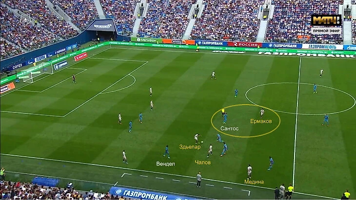 Например, в одном из эпизодов Круговой остался против Гайича и Карраскаля. Эпизод начался с открывания Чалова в глубину, а продолжился подачей Медины после смены позиции с Мойзесом.