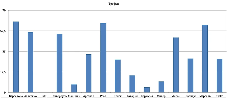 Первое. Главные клубы Европы – понятие крайне относительное, поэтому обсчитывали мы «Барселону», «Атлетико», «Реал», «МЮ», «Ливерпуль», «Челси», «Манчестер Сити», «Арсенал», «Баварию», «Боруссию», «Интер», «Милан», «Ювентус», «ПСЖ» и «Марсель». 15 команд, у каждой из которых есть неплохая коллекция трофеев, богатая история или успех сейчас. А у некоторых клубов есть все выше перечисленное сразу. На место второго клуба из Франции претендовали «Лион» и «Монако», но «Лион» был успешен в основном только в нулевых (даже у ПСЖ относительно успешных периода два – эпоха после прихода шейхов и девяностые). А у «Монако» не настолько много трофеев. У «Сент-Этьена» же плохие результаты сейчас. В подведении итогов сравниваться будут не только показатели отдельных клубов, но и стран. Хорошо бы еще было подсчитать очки в среднем за матч, но такая статистика не находится в контексте тренеров 80-летней давности.