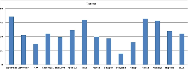 В лидерах уже нет «Милана», но зато в топ-3 оказывается «Марсель». Можно сказать, что на протяжении своей истории «россонери» слишком «доверяли» своим бывшим игрокам, а «провансальцы» «недооценивали» своих легенд (конечно, с огромной натяжкой). Вообще по трофеям и по тренерам довольно разная статистика – «Атлетико» и «Ливерпуль» выиграли около половины своих трофеев с бывшими игроками, при этом «доверяя» им лишь на 30 процентов (опять же, все формулировки крайне спорные, так как речь об огромных периодах).Из «переоценивающих» можно так же выделить «Арсенал» и «Ювентус». Но зато все ровно точно так же у «МЮ» и «Боруссии», разве что отметим огромную разницу у «красных дьяволов» – примерно каждый пятый их тренер – бывший игрок, а вот успехом такие назначения никогда не оборачивались, из-за чего и разница в 22 процента.