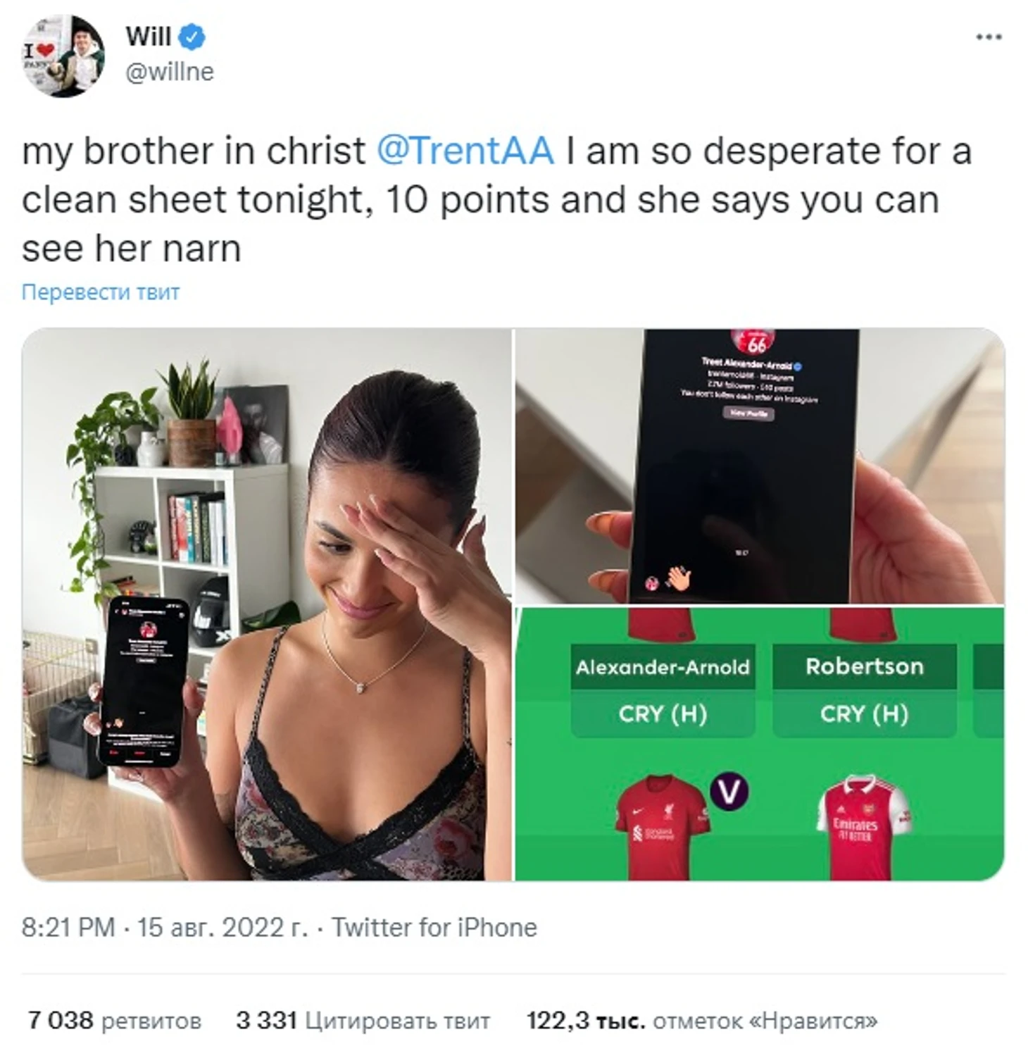 Оказалось, что у девушки есть парень, фанат fantasy-футбола, у которого в команде как раз есть Александер-Арнольд.