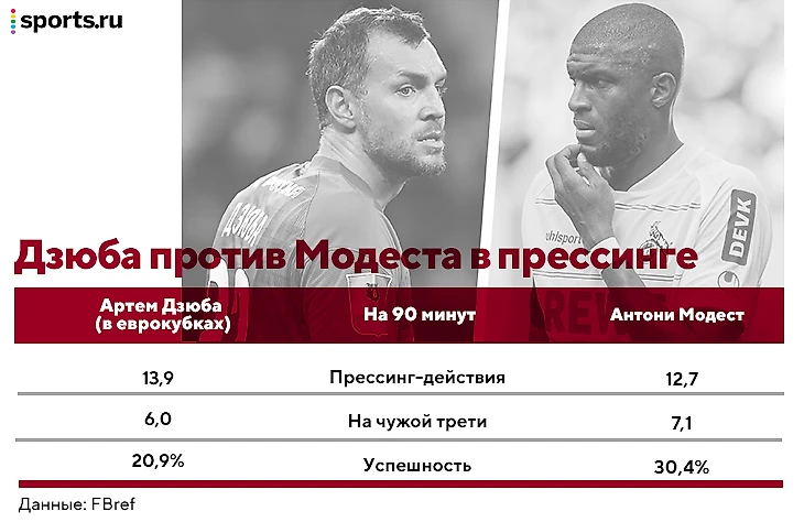 Баумгарт понимает, что вряд ли большой форвард в командах его уровня будет достаточно мобилен, чтобы давить по всем направлениям – он учитывает этот элемент. Данные по прессингу Дзюбы есть только по еврокубкам – в сравнении с Модестом он выглядит так: