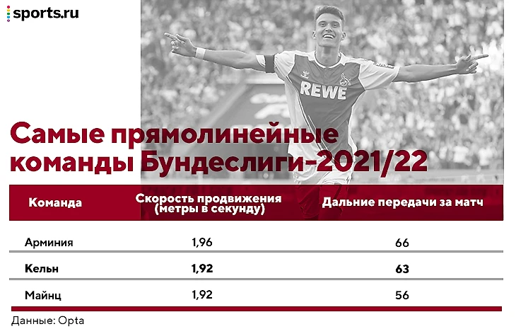 Есть и более простой факт, который подчеркивает аномальную скорость возврата мяча: у «Кельна» по итогам прошлого сезона было 4-е владение в Бундеслиге (54,8%) при 9-й точности передач (77,4%). Ни одна другая команда с владением больше 51% не опустилась ниже 80% точности. Это логично: точные передачи помогают повышать владение. «Кельн» же много владеет мячом исключительно потому, что быстро его возвращает (а потом играет вертикально на нападающего, как описывали выше).