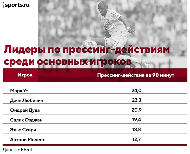 Но перед радикальным выводом давайте изучим роли внутри прессинг-системы. Так картина выглядела в прошлом сезоне: Ут начинает давление, серьезный объем дают все полузащитники в ромбе, а Модест работает явно меньше всех (но с умом):