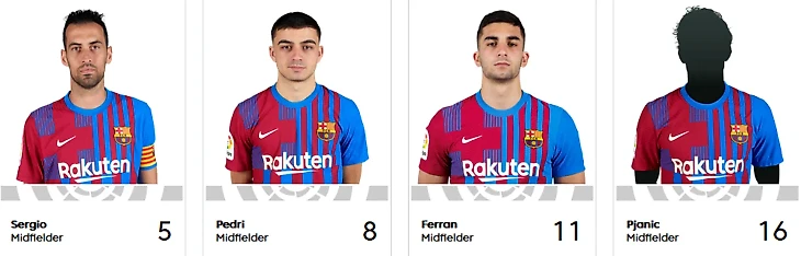 №5 – Бускетс, №8 – Педри, №11 – Ферран, №16 – Пьянич, №19 – Кессие, №21 – Де Йонг, №30 –Гави , №32 – Пабло Торре