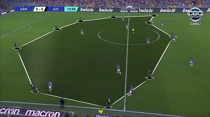 Почему? Во-первых, «Сампдория» хорошо подготовилась, не выбрасывалась на центрбеков и потому создала численное преимущество на линиях передач – вдесятером перекрывала семерых ювентини. Взгляните на работу атакующей тройки. Она не только отрезает Локателли от центрбеков, но и реагирует на его заходы за линию – сразу перекрывает коридор между ним и Маккенни. То есть если один из них получит вертикальный пас, отыграться с другим не сможет – и останется один против всех.