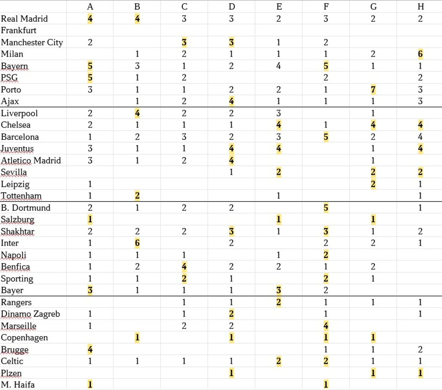 Желтым цветом выделены команды, которые попали в самую популярную или одну из самых популярных для себя групп. Зеленым - если команда попала практически в самую популярную группу, для примера - Тоттенхэм чаще всего попадал в группу B - 2 раза, но она оказалась занята Ливерпулем, которому было важнее попасть в группу B. Поэтому Тоттенхэм отправляется в группу A, которая уступает самой частой для него группе лишь на 1 попадание. Красным - если команда попала в группу, которая уступает самой частой на 2 попадания. Разумеется, красных должно быть как можно меньше.