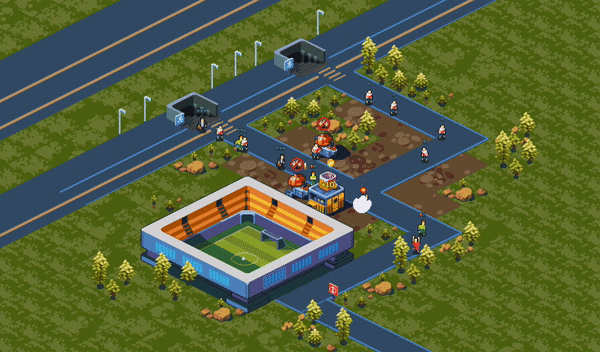 Чтобы завлекать зрителей на стадион, нужно строить здания. Каждое здание имеет свои уникальные характеристики и механики. Одни просто обслуживают болельщиков, делая их счастливыми, другие работают только на поднятие экономики. Если игрок не справляется с наплывом толпы, есть и одноразовые здания, которые исчезают после взаимодействия с болельщиками.