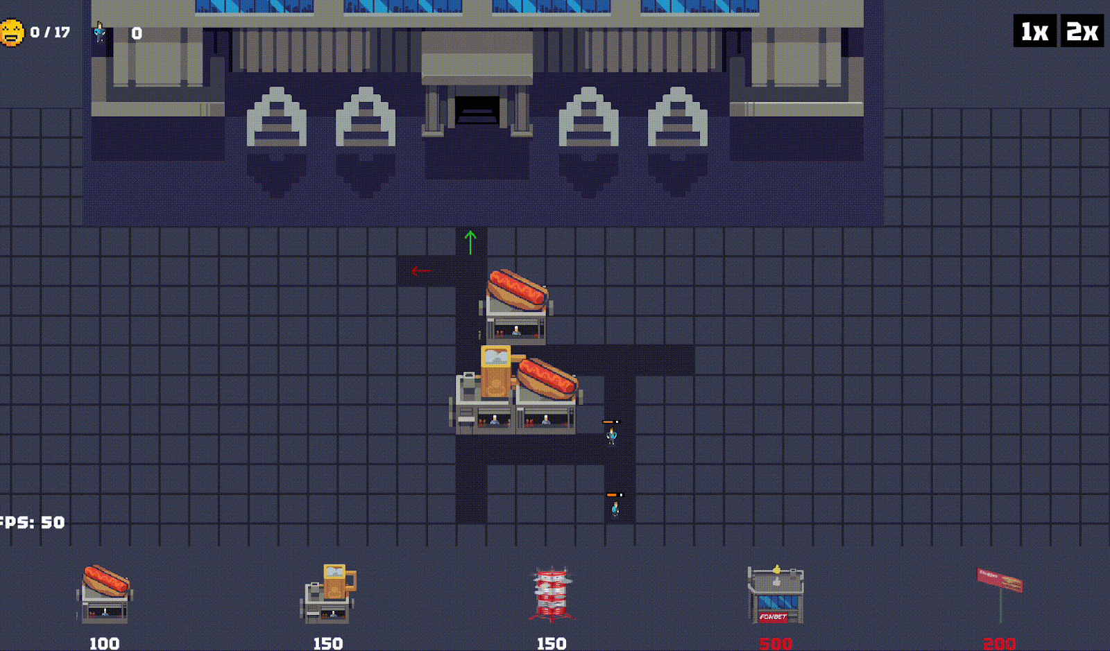 Игра обрастала механиками. Одна из основополагающих механик в «защите башни» – скорострельность зданий. Благодаря большому количеству юнитов и маленькой скорострельности башен игра подталкивает что-то менять в стратегии и выставлять новые и новые постройки. В нашей игре таким же образом работает принцип вместимости зданий и скорости обслуживания этого здания. К примеру, сосисочная вмещает одного болельщика и выдает хот-дог за 2 секунды, а вот сосисочная второго уровня (до нее можно проапгрейдиться в процессе прохождения уровня) уже вмещает 2 болельщиков одновременно и обслуживает за 3 секунды.