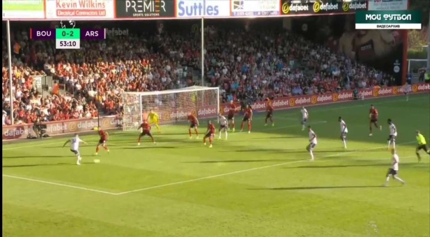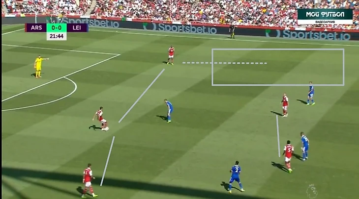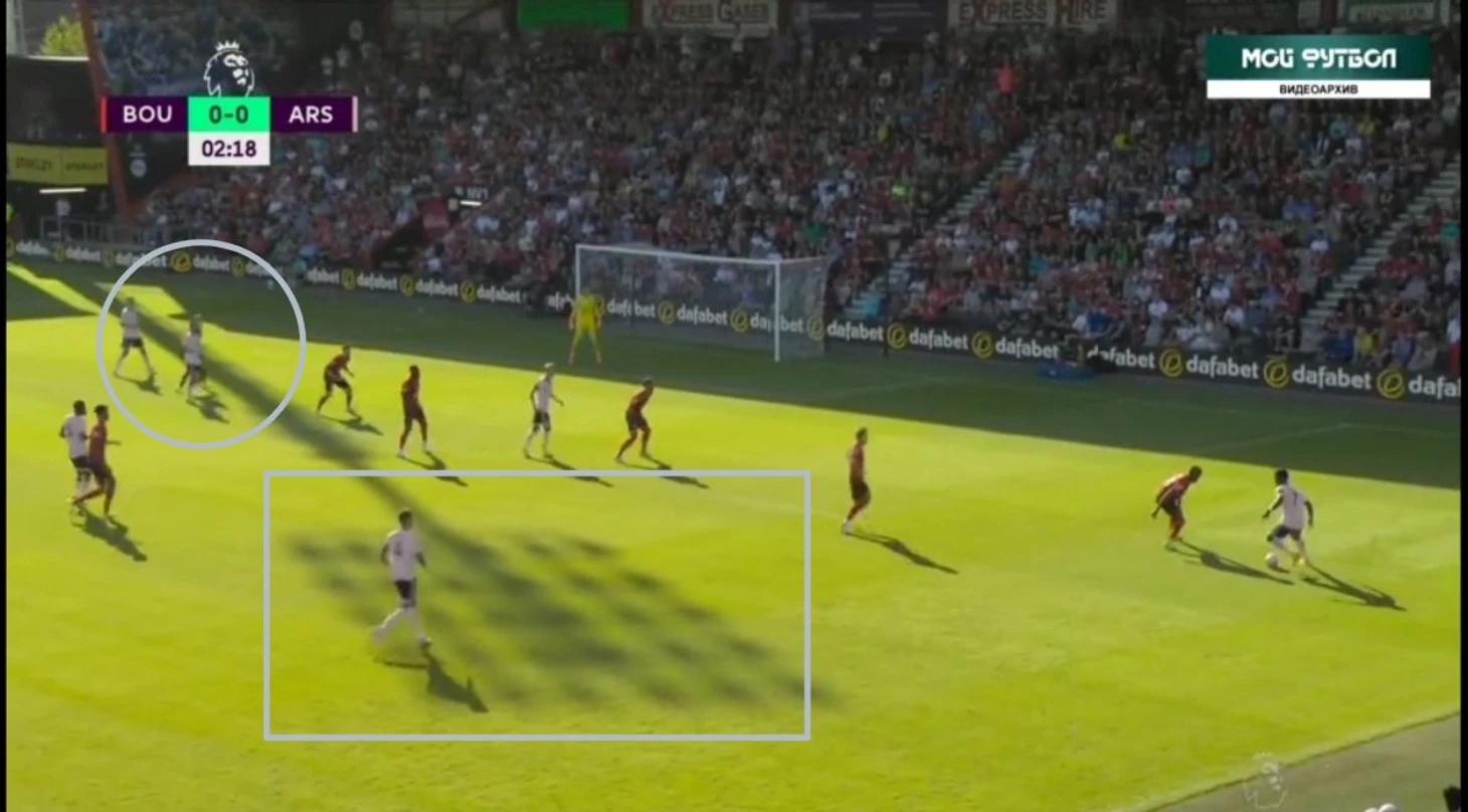 Дальше игроки комбинируют на фланге, стараясь проникнуть в штрафную или найти возможность быстро перевести мяч направо, где Сака будет изолирован с защитником и сможет показать свои лучшие качества дриблинга. Но в большинстве случаев Сака стягует двох соперников освобождая пространство для Бена Вайта в полуфланге, откуда он делает отличные подачи в штрафную: