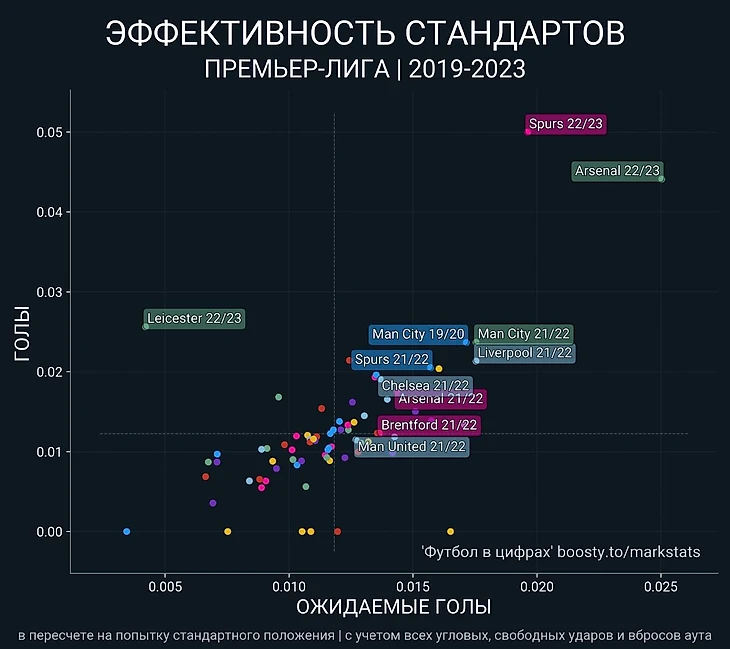 Большую часть моментов Арсенал создаёт с стандартов. Вот график, который показывает, что лучше них только Тоттенхэм.