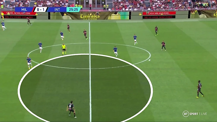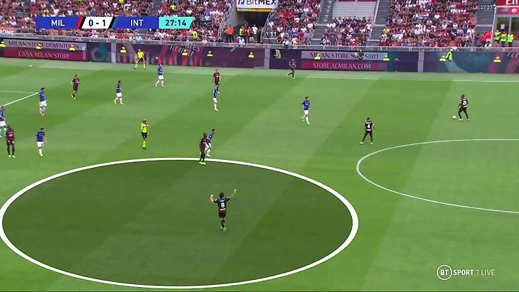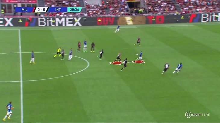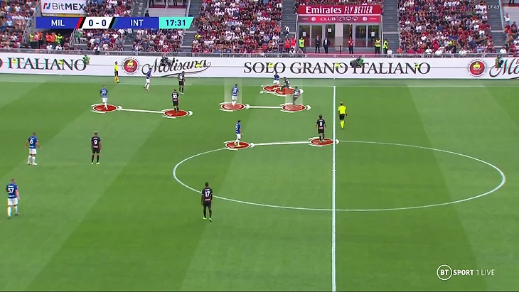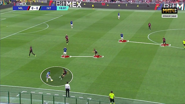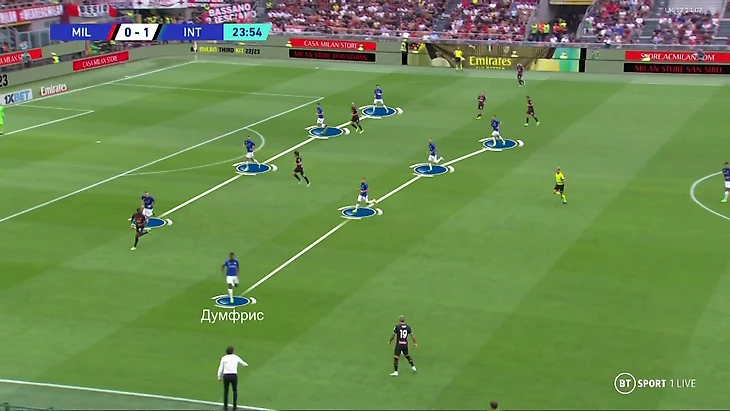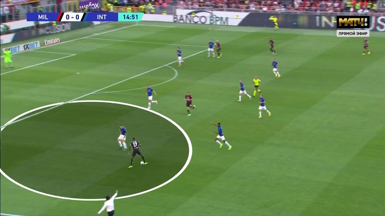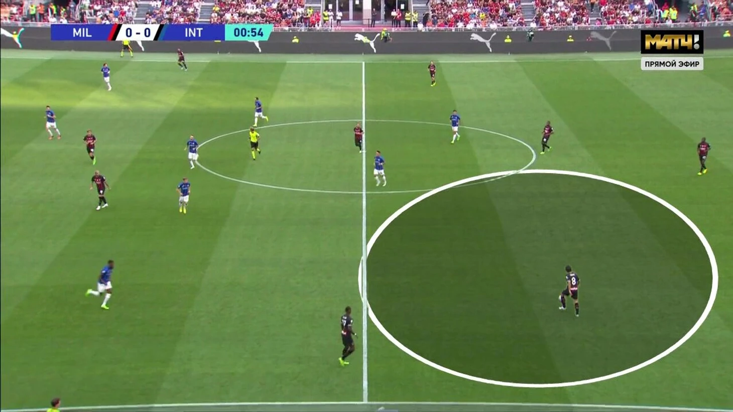 Отдельно нужно похвалить «Милан» за органичность переходов от персональной игры в зоне мяча к зонным смещениям в дальней части поля. Именно из-за уровня организации противодействовать такому давлению было очень трудно. Постепенно «Интер» вынужденно отказался от ввода мяча коротким пасом. Команда Индзаги не предложила вариантов розыгрыша, с которыми не справился бы «Милан» (хотя было одно исключение).