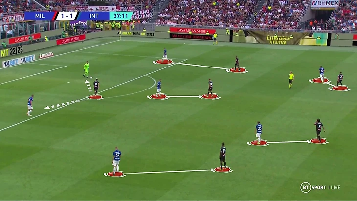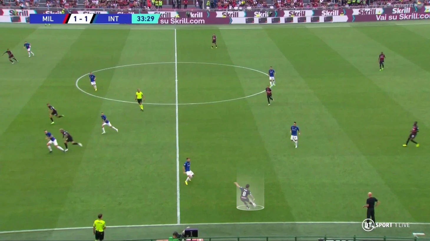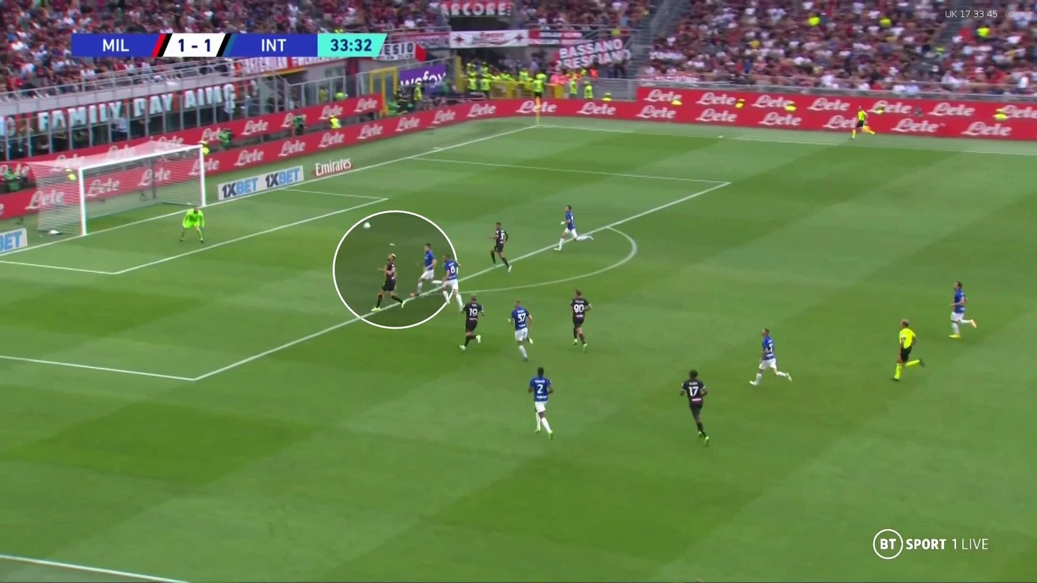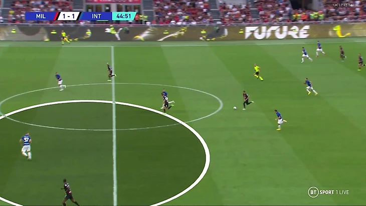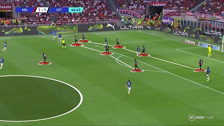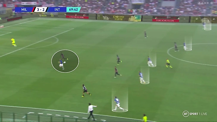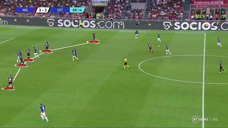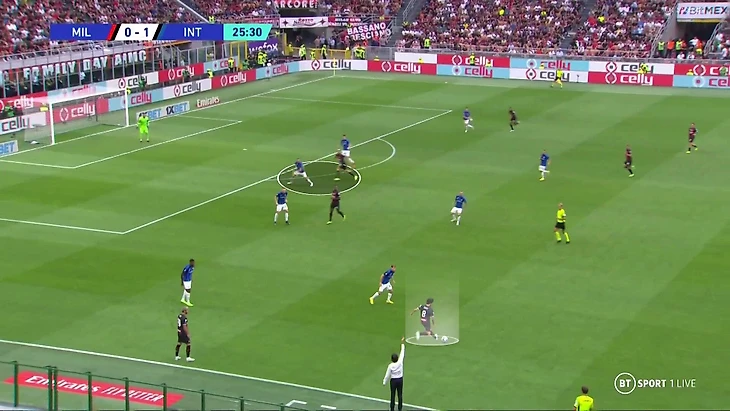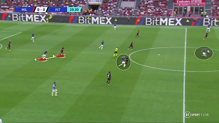 Отдельно нужно похвалить «Милан» за органичность переходов от персональной игры в зоне мяча к зонным смещениям в дальней части поля. Именно из-за уровня организации противодействовать такому давлению было очень трудно. Постепенно «Интер» вынужденно отказался от ввода мяча коротким пасом. Команда Индзаги не предложила вариантов розыгрыша, с которыми не справился бы «Милан» (хотя было одно исключение).