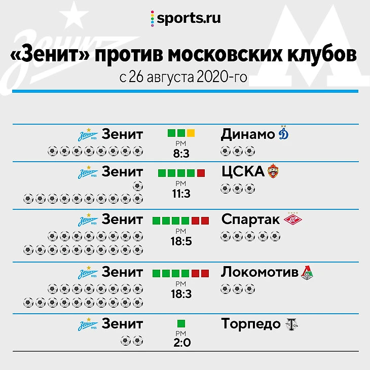 «Зенит» не проигрывает московским командам уже 21 матч подряд