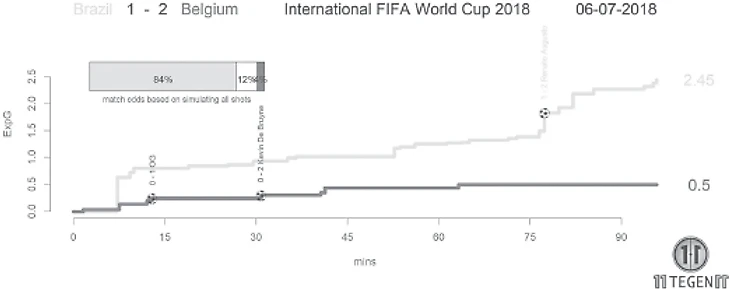 Большинство (нейтральных) зрителей, вероятно, вспомнят матч Бразилия - Бельгия как самую зрелищную игру турнира, завершившуюся ошеломляющей победой аутсайдеров. В Бельгии, вероятно, еще долгие годы будут об этом говорить, учитывая, что этот матч проложил путь к их лучшему результату на чемпионате мира в истории — третьему месту. Тот факт, что победа была результатом удачи, по всей вероятности, не останется столь заметным в коллективной памяти. Те, кто не любит говорить об удаче и невезении, когда речь заходит о столь важных результатах, могут с помощью данных выразить это более прозаично: согласно качеству голевых возможностей сборной Бельгии, у них было 4% шансов на победу в основное время. Если бы игра была сыграна точно так же 100 раз, ожидалось, что Красные дьяволы должны были выиграть четыре матча, проиграть 84 при 12 ничьих. Они извлекли выгоду из раннего автогола бразильцев и удара Кевина Де Брюйне после контратаки. Во втором тайме подопечные Роберто Мартинеса сами создали лишь один небольшой голевой момент и бо́льшую часть времени защищались от многочисленных и отчасти многообещающих попыток Seleção, которые привели к одному единственному голу.