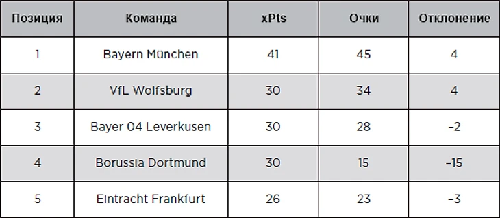 «Использование аналитики может помочь нам начать оценивать, были ли определенные результаты результатом большого мастерства или, возможно, были вызваны каким-то сочетанием "случайных обстоятельств"», — написал Трейнор в своем блоге. В случае с «Дортмундом» он обнаружил, что цифры указывают на случайную последовательность неудач. Они создали достаточно хороших голевых моментов, чтобы закончить год с 25 голами вместо 18. На другом конце поля их оборона тоже была не столь плоха, как предполагали 26 пропущенных мячей. По его словам, они должны были пропустить лишь 17 мячей. Если сложить оба показателя, то у «Дортмунда» должна была быть разница мячей +8, а не -8, и, как следствие, многие матчи должны были завершиться с более положительными результатами. Экстраполируя «Ожидаемые очки» (xP) из этих цифр, Трейнор подсчитал, что «Дортмунд» должен был набрать 30 очков, в отличие от скудных 15, которые они получили фактически. Разница привела к огромному расколу в таблице: с бо́льшим количеством очков «Дортмунд» к зимнему перерыву занимал бы четвертое место.