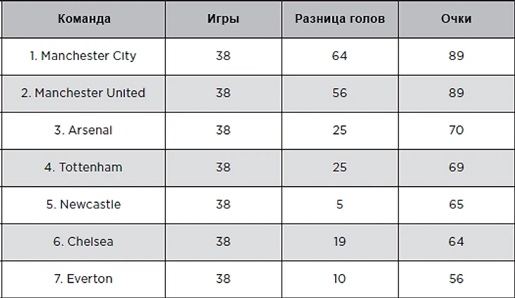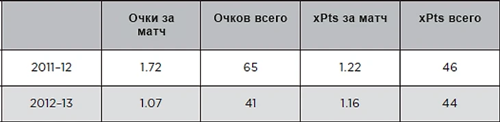 Более пристальный взгляд на несоответствие между выступлениями и результатами приводит нас к таким захватывающим явлениям, как история «Ньюкасла Юнайтед» в сезоне 2011/12. Сороки, которых в то время тренировал Алан Пардью, неожиданно заняли в том сезоне пятое место. Болельщики «Ньюкасла» с теплотой вспомнят свою лучшую кампанию за последние 15 лет и чудесное появление Паписса Сиссе, который присоединился к команде в январе 2012 года из «Фрайбурга» и забил 13 мячей в 14 матчах. Вот как выглядела таблица в конце сезона: