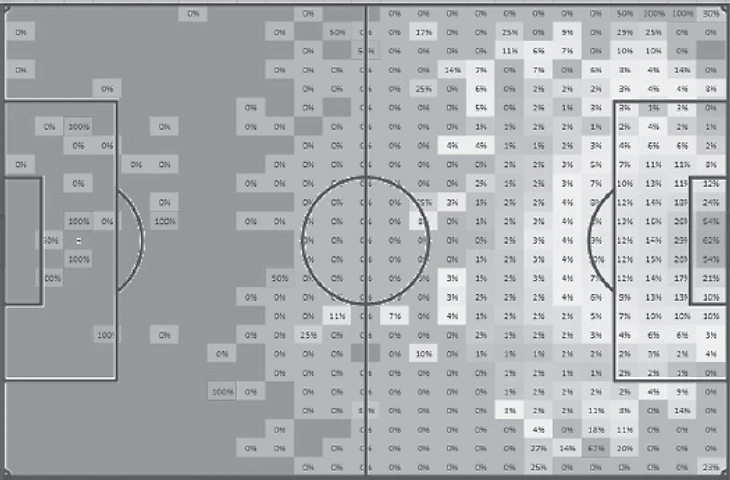 Этот тип статистического анализа может быть распространен на другие типы ударов — при условии, что мы знаем, откуда они были нанесены на поле и в каком конкретном контексте. Естественно, имеет значение, являются ли удары результатом действия с игры или со штрафных ударов, и это лишь один из отличительных факторов. Повсеместный сбор данных в большинстве профессиональных лиг позволяет нам сопоставлять десятки тысяч ударов из тысяч игр, видеть, откуда они были нанесены на поле, и определять, сколько из них попали в сетку ворот. Эта триангуляция дает нам карту игрового поля, которая может довольно точно предсказать вероятность попадания любого данного удара из любой заданной позиции.