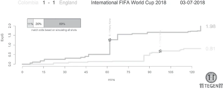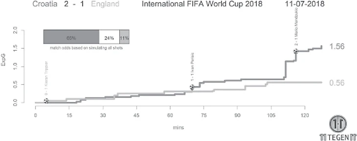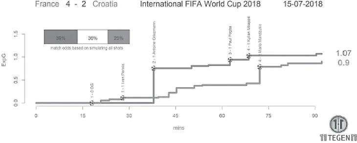 Есть еще один фактор, который нельзя упускать из виду в связи с Ожидаемыми голами. У каждой игры есть своя история. Решающее значение имеет не только качество и количество голевых моментов, но время их возникновения. Голландец Сандер Эйтсма, хирург из Гронингена, разработал так называемые xGplots, чтобы придать форму этому явлению. Эти «Графики ожидаемых голов», расположенные вдоль горизонтальной временной шкалы продолжительностью 90 минут, иллюстрируют ход игры в хронологическом порядке и дополняют наше понимание того, как лучше всего использовать показатель Ожидаемые голы. Несколько игр чемпионата мира по футболу 2018 года в России в этом отношении поучительны.