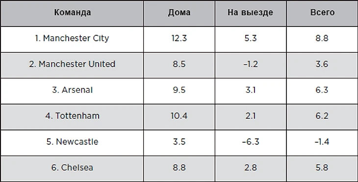 Второй признак, указывающий на то, что футбольные боги протянули руку помощи — это распределение голов. Каждый сезон Премьер-лига проводит 380 матчей, в которых случается примерно 8800 ударов и 1000 забитых мячей. Но не каждый гол имеет одинаковую ценность. Четвертый гол при победе со счетом 4:0 не так важен, как четвертый гол при победе со счетом 4:3. Исходя из этого, равная нулю разница мячей может означать несколько очень разных вещей. Серия из семи игр, приведшая к результатам 0:1, 0:1, 0:1, 6:0, 0:1, 0:1, 0:1 принесла бы только три очка из возможных 21. Но семь игр, заканчивающиеся 1:0, 1:0, 1:0, 0:6, 1:0, 1:0, 1:0 привели бы к совершенно иному результату: 18 очков.