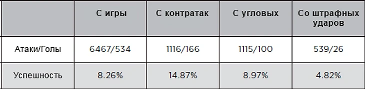Учет всех ударов команды в ходе игры и анализ вероятностей дает общий балл, называемый «Ожидаемые голы» (xG). Удар Ван Бастена добавит 0,02 к подсчету, пенальти — 0,75. Чтобы сделать xG более значимым, также учитывается контекст удара. Например, удары с 11 метров с бо́льшей вероятностью приведут к голам, нежели удары головой, равно как и голы с контратак — тогда оборона соперника, как правило, более дезорганизована. Попытки со стандартов тоже имеют определенную вероятность. Ситуационный контекст удара оказывает заметное влияние на его шансы залететь в ворота, как показывает эта таблица из Премьер-лиги.