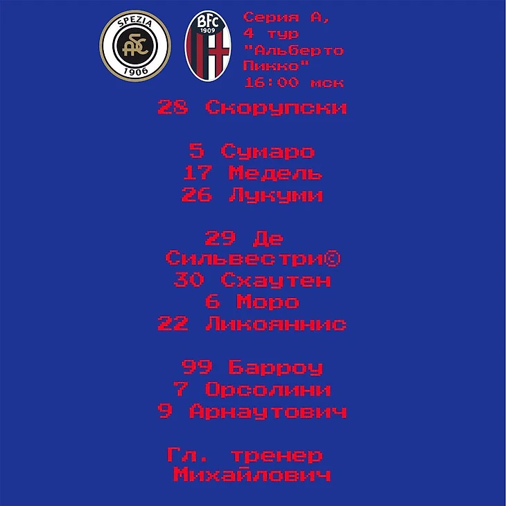Игру с "Салернитаной" БФК закончила под оглушительный свист своих болельщиков. Михайлович подвергся настоящей обструкции. Оскорбляли и как тренера, и лично, как человека. За Синишу вступилась дочь Виктория, написавшая в ИГ пост, что, мол, как тренера пожалуйста, как человека - не смейте. Вот на таком фоне команда подходит к встрече со "Специей". В целом Михайлович кажется сосредоточенным на работе. На вчерашней тренировке он обратился к команде с призывом играть более страстно и менее скованно: иногда БФК кажется попросту перегруженной и боящейся совершать ошибки. О "Специи": Летом команду из Лигурии возглавил Лука Готти - сейчас "Орлы" не те, что прежде. Если во времена предыдущих тренеров, блестящих тактиков нового поколения Итальяно и Мотты, "Специя" отличалась смелыми ходами (вроде Агудело в роли ложной 9), то сейчас команда все сильнее уподобляется новому Мистеру. Готти довольно консервативен, его кредо - упор на физику, надёжность тылов и обязательно наличие большого нападающего, в данном случае Нзолы. Фаны команды, тем временем, остались недовольны рынком и провели акцию протеста: доподлинно известно, что Готти просил усиления во все линии, но ему предоставили лишь Итана Ампаду. Михайлович: "Ответственность за ситуацию лежит на мне. Я тренер, выбираю тактику, и желаю парням только добра. Они проявили себя хорошими людьми и игроками. Уверен, выберемся из этой ситуации. Я вижу эту волю к победе у своих игроков. Мы всегда открывали счёт, за исключением матча в Милане. Нужно быть более отчаянными, чтобы доводить дело до победы. Ну и, конечно, в Италии могут начать говорить о кризисе уже после 4 игр. Слова моей дочери? Она обиделась на то, что написали. Это выходило за рамки футбольного мира. У меня нет соцсетей, я их не читаю. Детям нужно учиться быть спокойнее. С Пошем я поговорил, ему нужно время. Не каждый может сходу заиграть в Серии А. Мои слова, что я его не знаю? Я не знаю всех игроков мира, буду честен. Так случается, что выбор клуба падает на игрока, не знакомого тренеру. Домингес должен набирать форму после операции. Вижу в Моро Брозовича: как и он, стремится играть вертикально. Ему, как мне кажется, нужно набрать вес, как и всем, кто едет в Италию. Отлично знаю о Моро от друга, который работает в "Динамо".