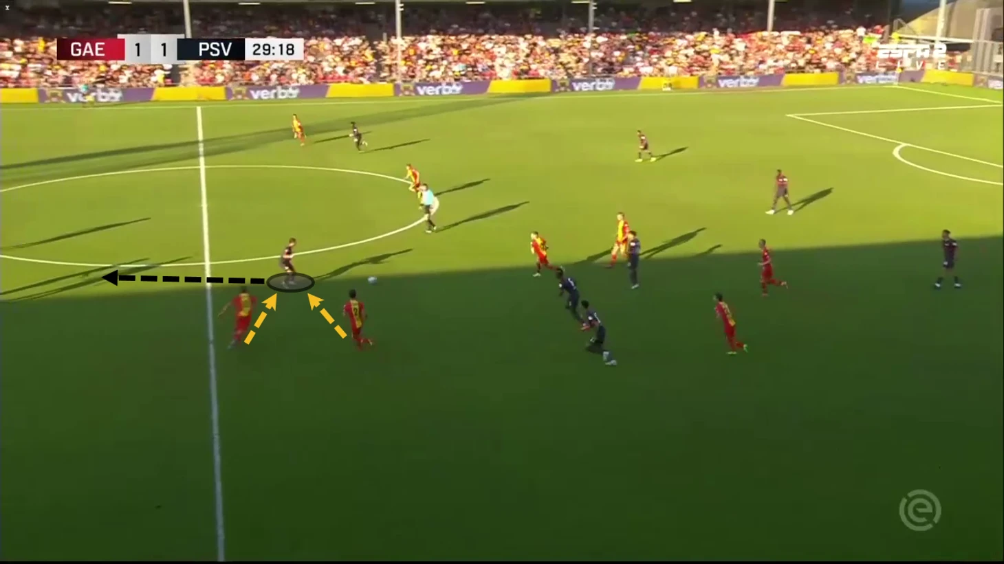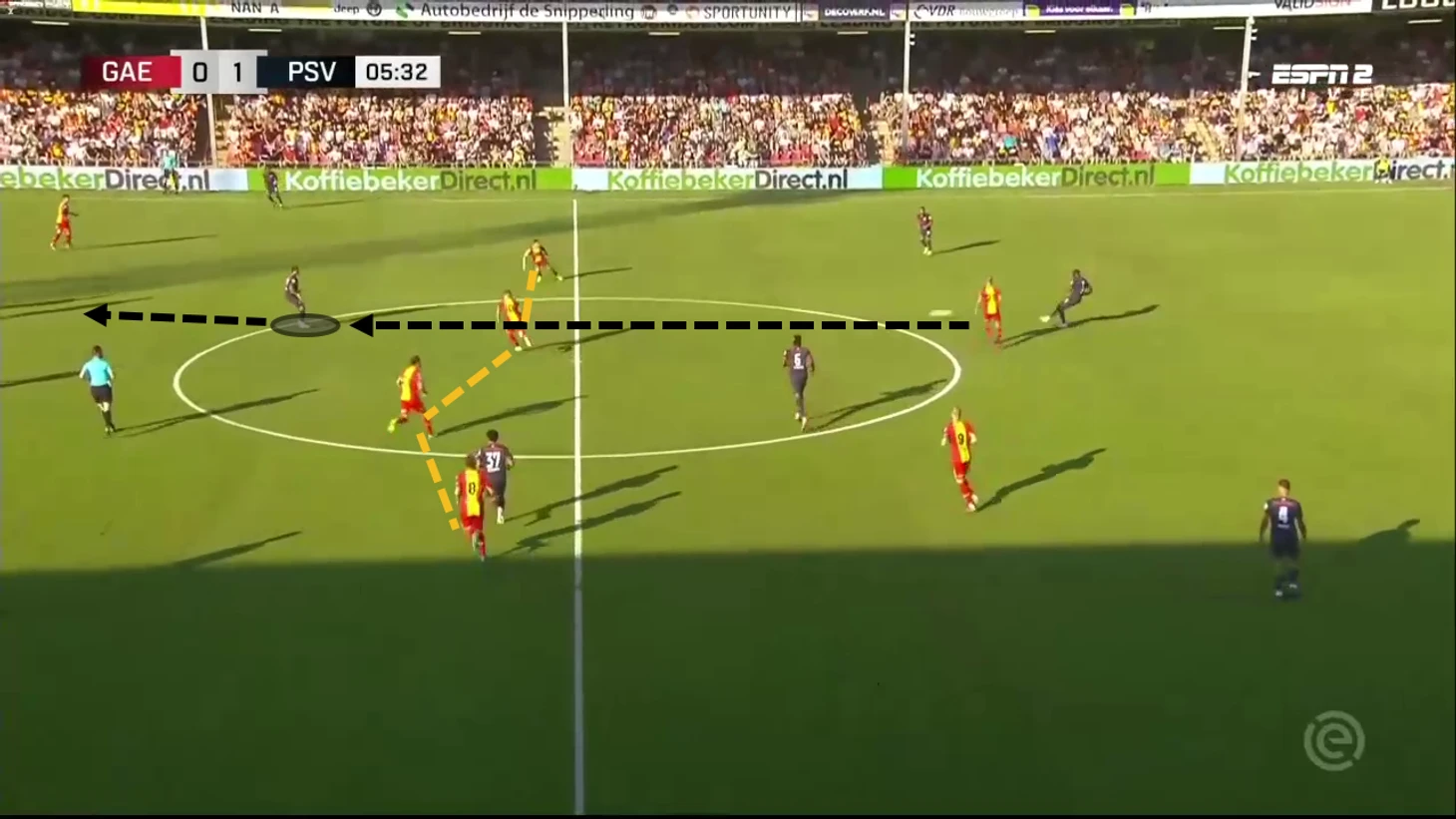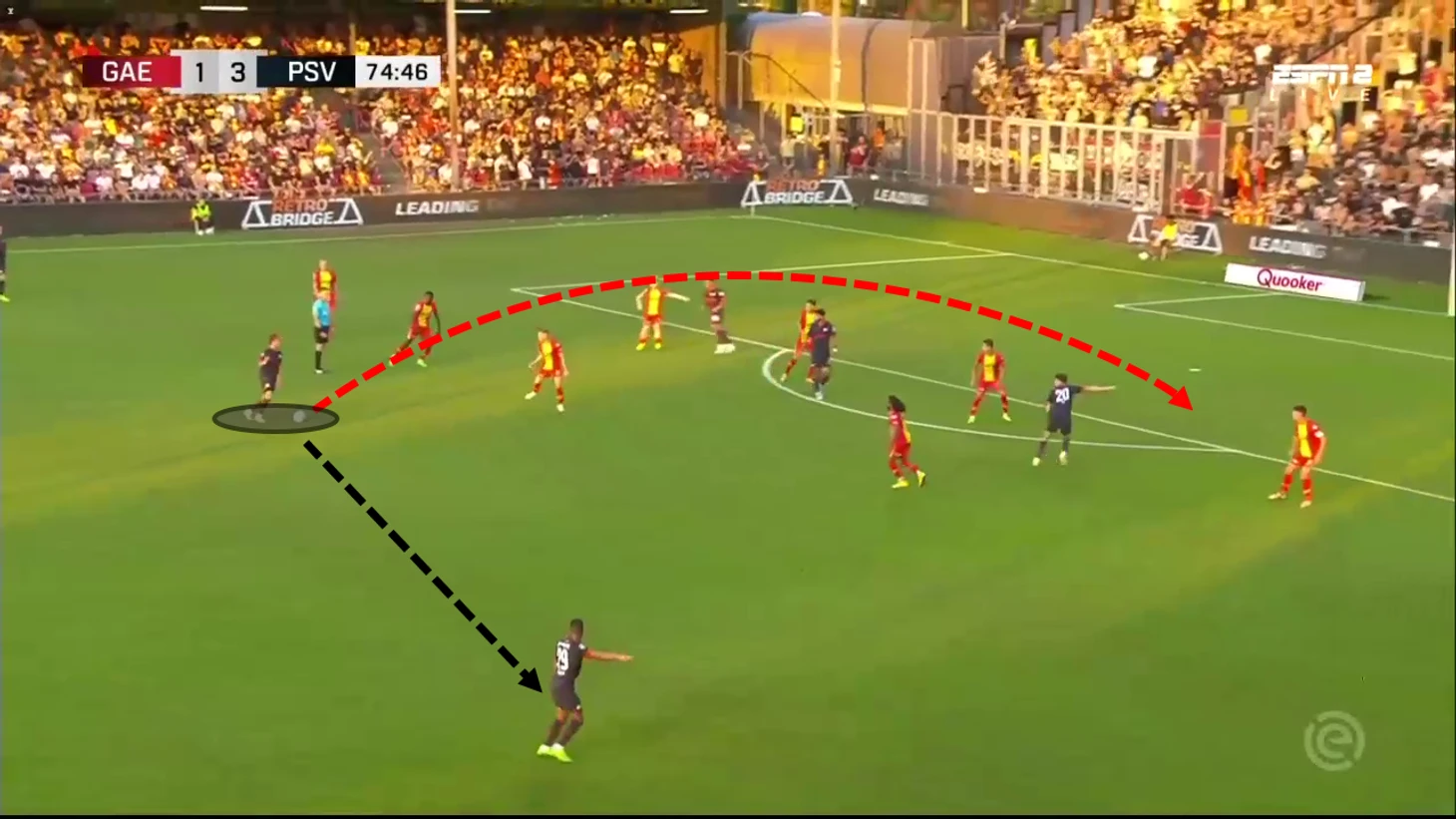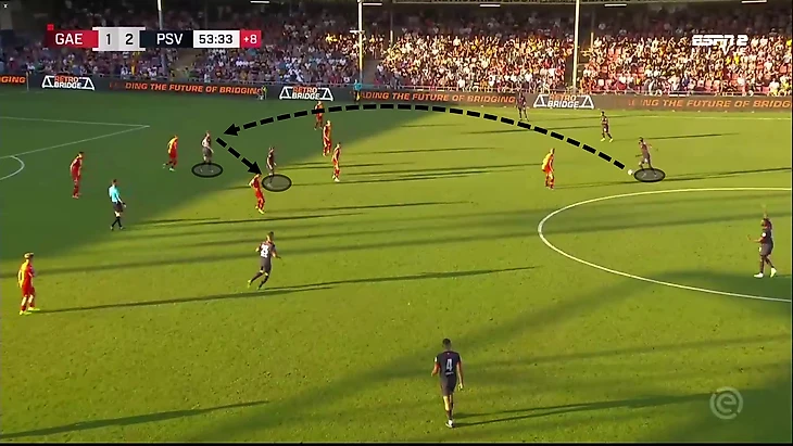 Близкое расстояние между нападающим и "10" означает, что можно проводить эффективную комбинационную игру. Это дает ПСВ хороший способ продвижения вперед, так как они имеют линию с двумя активными нападающими.