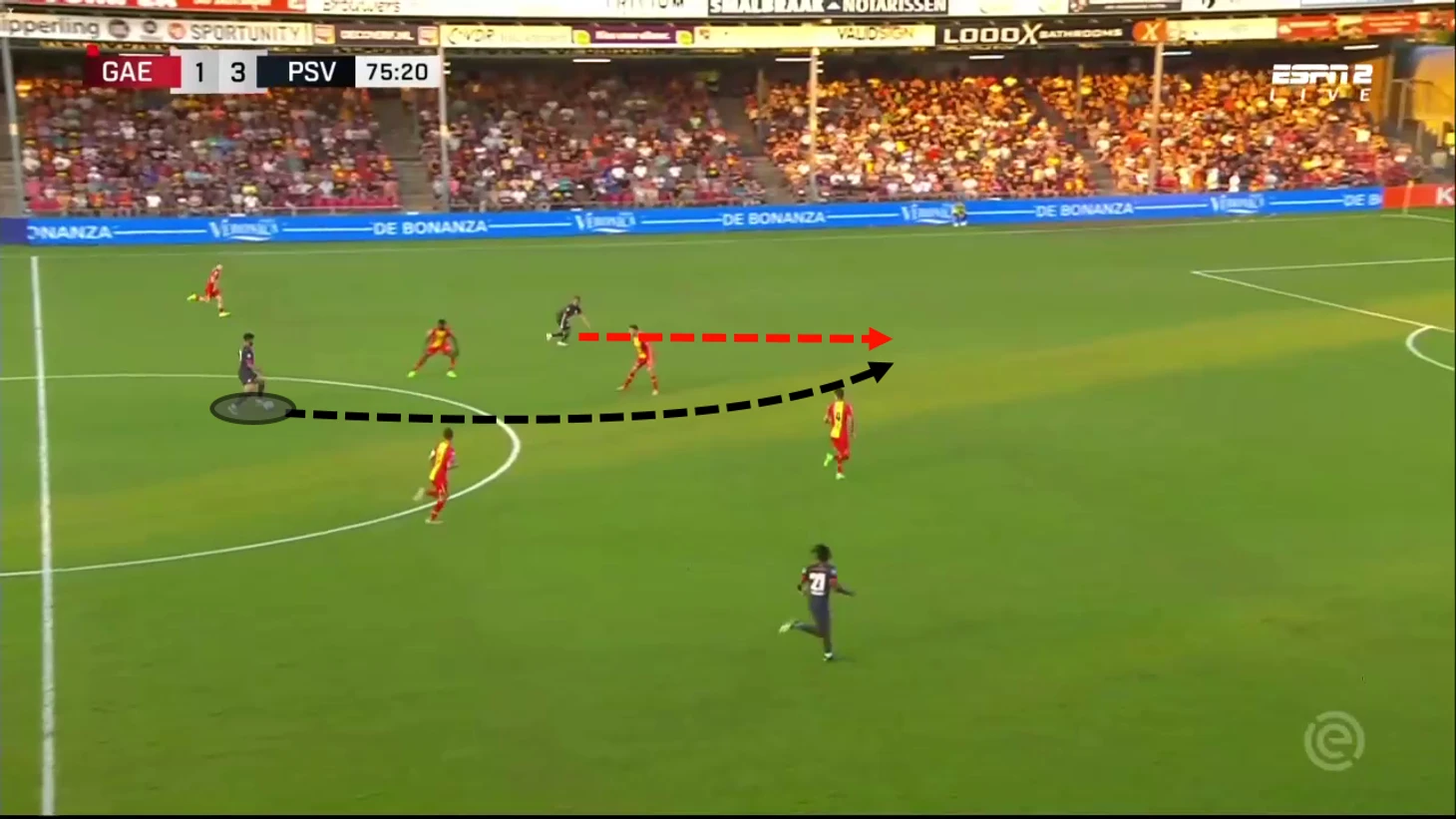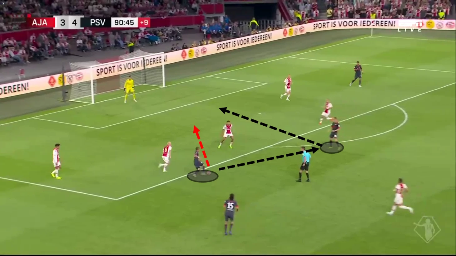 Первый гол Симонса за ПСВ был забит в результате великолепно отработанной комбинационной игры с партнером по команде в верхней части поля. Быстрое мышление и движение Симонса - это то, что помогло забить гол, а также самообладание, с которым он обвел вратаря. Ниже вы можете видеть, как Симонс быстро разыграл комбинацию с партнером по команде.