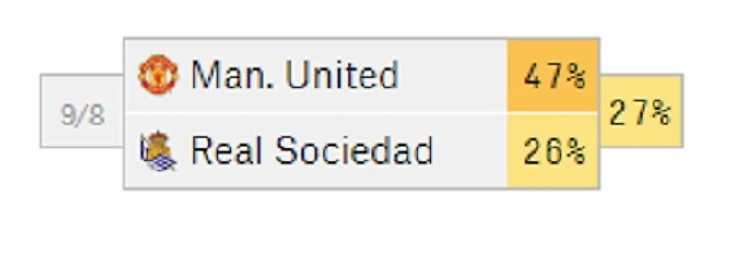 По прогнозам Суперкомпьютера FiveThirtyEight «МЮ» должен победить в матче – у него 47% шансов на итоговый успех. У «Сосьедада» по расчету компьютера 26% шансов на победу, вероятностью ничьей – 27%.